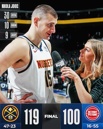 Il due volte MVP in carica chiude a un assist dalla tripla doppia finendo con 30 punti, 10 rimbalzi e 9 assist, sbagliando solo quattro dei 18 tiri tentati dal campo nei 34 minuti abbondanti in cui rimane sul parquet. Il centro serbo guida un quintetto tutto in doppia cifra con 20 punti di Kentavious Caldwell-Pope, 19 con 10 assist di Jamal Murray e 15 a testa per Aaron Gordon e Michael Porter Jr. Con questo successo Denver si assicura matematicamente un posto ai playoff e il titolo della Northwest Division con settimane di anticipo sulla fine della regular season