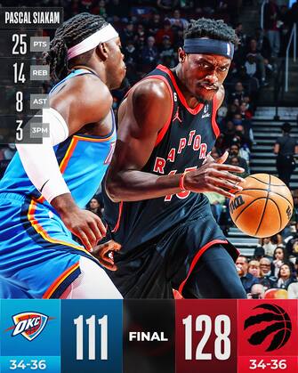 TORONTO RAPTORS-OKLAHOMA CITY THUNDER 128-111 | Diventano sei le vittorie consecutive in casa dei Raptors, in ripresa dopo la pausa per l’All-Star Game grazie alle doppie doppie di Pascal Siakam (25+14) e Jakob Poeltl (16+12, la terza in fila), oltre ai 23 punti realizzati da Gary Trent Jr. e i 19 a testa di Fred VanVleet e Scottie Barnes. Toronto travolge OKC per 23-6 nei punti in contropiede, tenendo Shai Gilgeous-Alexander a 29 punti davanti ai suoi connazionali e interrompendo così la striscia di tre successi in fila dei Thunder