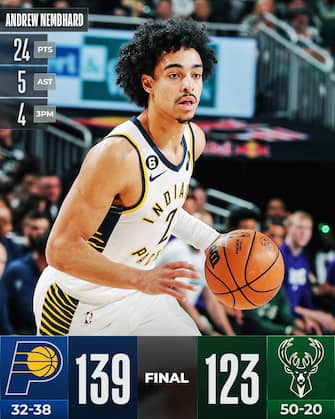 MILWAUKEE BUCKS-INDIANA PACERS 123-139 | Battuta d’arresto per la miglior squadra a Est, che si fa sorprendere in casa dai Pacers privi di Haliburton per un problema alla caviglia. Indiana vince a Milwaukee per la prima volta dal 2018 mandando sette giocatori in doppia cifra guidati dai 24 di Andrew Nembhard e i 22 di Aaron Nesmith, autore di 6 delle 22 triple degli ospiti — eccezionali dall’arco in particolare con un secondo tempo da 13/19. I Bucks invece si fermano a 11/32 di squadra e perdono nonostante i 25 di Giannis Antetokounmpo e i 19 di Jrue Holiday