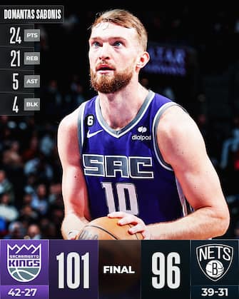 BROOKLYN NETS-SACRAMENTO KINGS 96-101 | Per la prima volta in 17 anni i Kings torneranno ad avere una stagione con un record vincente. La 42esima vittoria di questa eccellente regular season porta la firma di Domantas Sabonis, autore di una doppia doppia da 24 punti e 21 rimbalzi, e di una difesa capace di tenere gli avversari sotto i 100 punti segnati nonostante fossero in back-to-back in trasferta arrivando da Chicago. Ai Nets non bastano i 23 di Mikal Bridges e i 18 di Spencer Dinwiddie