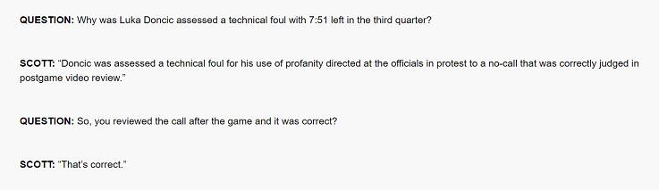 La storia del 16° tecnico stagionale di Luka Doncic assume contorni quanto meno strani. Fischiatogli sul campo di Charlotte nella gara persa dai suoi Mavs contro gli Hornets, doveva comportare la sospensione automatica di una partita nella gara successiva, quella disputata nella notte da Dallas a Indianapolis. Invece Doncic contro i Pacers è stato regolarmente in campo e anche (se non soprattutto) grazie ai suoi 25 punti, 7 rimbalzi e 6 assist i Mavs sono tornati a centrare una fondamentale vittoria dopo 4 sconfitte consecutive, che li avevano fatti precipitare fuori all'undicesimo posto a Ovest, fuori dalla zona play-in (la vittoria non ha cambiato, per il momento, la loro posizione). Ma veniamo al tecnico in questione: il fischio di Nick Buchert, uno dei tre arbitri chiamati a dirigere la gara di Charlotte, era stato nel dopo-partita così spiegato dal capo terna Kevin Scott: "A Doncic è stato fischiato un fallo tecnico per aver rivolto un insulto verso un arbitro, protestando per un non-fischio che si è poi rivelato corretto una volta rivista l'azione a fine gara". Scott quindi, anche dopo aver visionato a video l'azione, conferma la decisione arbitrale e segnala l'insulto della stella dei Mavs come la causa del tecnico.