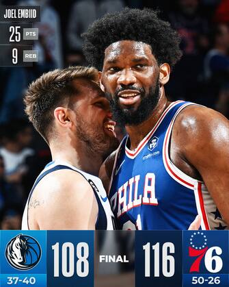 PHILADELPHIA 76ERS-DALLAS MAVERICKS 116-108 | I Sixers ritrovano Embiid e Harden in campo e non casualmente anche la vittoria dopo tre sconfitte in fila. Il candidato MVP ne mette 25 con 9 rimbalzi mentre il playmaker confeziona una doppia doppia da 15 e 12 assist, arrotondati dai 22 punti di Tyrese Maxey per superare la resistenza dei Mavs. Gli ospiti hanno 24 punti, 10 rimbalzi e 8 assist da Luka Doncic e 23 da Kyrie Irving, ma non segnano negli ultimi 3:18 di gara e scivolano a una gara piena di distanza dal decimo posto di OKC