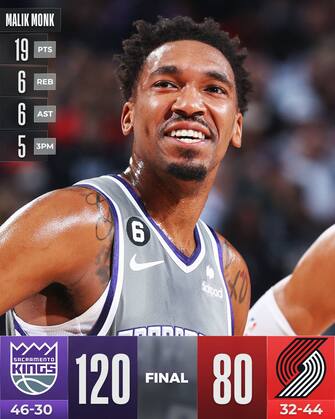 PORTLAND TRAIL BLAZERS-SACRAMENTO KINGS 80-120 | Dopo 17 lunghissimi anni di attesa, i tifosi dei Sacramento Kings possono tornare a respirare. L’assenza dai playoff più lunga dello sport professionistico USA è finalmente finita, con i Kings che aprono in due la partita nel terzo quarto (33-18) e veleggiano facilmente fino al +40 finale. Sono cinque i giocatori in doppia cifra guidati dai 19 di Malik Monk dalla panchina, con Keegan Murray che firma il record di triple per un rookie (188, superato Donovan Mitchell)