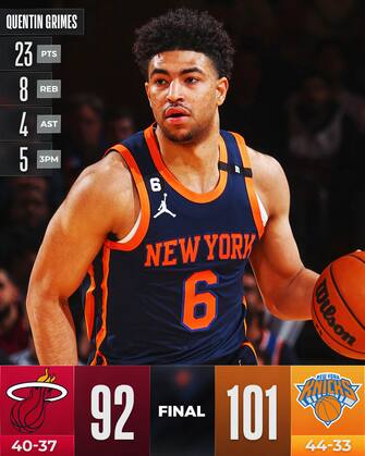 NEW YORK KNICKS-MIAMI HEAT 101-92 | Vittoria pesantissima dei Knicks che battono Miami anche senza Julius Randle - fuori nel secondo tempo a causa di una distorsione alla caviglia - e merito dei cinque giocatori che coach Thibodeau cavalca per tutto il quarto periodo (senza fare cambi), sfruttando al meglio i 24 punti di Immanuel Quickley e i 23 di Quentin Grimes. Un ko allontana sempre più gli Heat dalla zona d’accesso diretto ai playoff, con Jimmy Butler che non va oltre i 12 punti e Gabe Vincent che ne mette a referto 21 con 8/11 dal campo