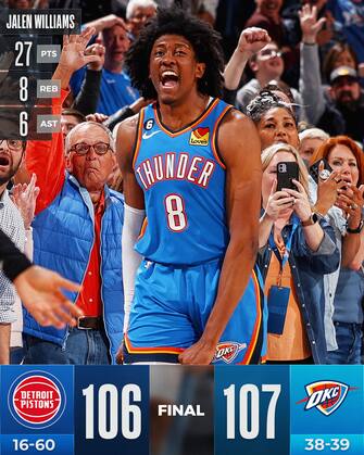 La giocata decisiva la piazza Jalen Williams - rookie sempre più decisivo nelle dinamiche dei Thunder e miglior realizzatore dei suoi in una serata in cui OKC fa a meno dell’infortunato Shai Gilgeous-Alexander. Sull’errore di un Josh Giddey da 18 punti, Williams trova il modo di correggere a canestro con un tap-in il tiro e regalare il sorpasso ai Thunder, coronando così un match da 27 punti, 11/19 dal campo, otto rimbalzi e sei assist. Determinanti nella corsa al play-in saranno le prossime cinque sfide, tutt’altro che semplici da affrontare