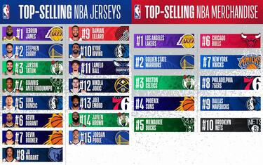 I Lakers e LeBron James restano i più venduti in una classifica che tiene conto della seconda parte di regular season - quando, per intenderci, Kyrie Irving e Kevin Durant hanno fatto vendere un bel po’ di maglie dopo aver cambiato squadra. Questo però non è bastato per prendersi il podio in una classifica in cui a farla da padrone sono dei nomi che potremo ritrovare in campo anche a maggio inoltrato a inizi giugno, quando ci sarà da assegnare il titolo NBA