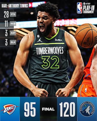 Minnesota riaccoglie in squadra Rudy Gobert, autore di 21 punti con 10 rimbalzi e 6/11 al tiro, ma a far la voce grossa per tutta la serata è Karl-Anthony Towns, che chiude anche lui in doppia doppia con 28 punti e 11 rimbalzi tirando un ottimo 11/16 dal campo. Il terzo giocatore dei Timberwolves in doppia doppia è Anthony Edwards, che riscatta la prestazione disastrso del primo play-in con una gara da 19 punti, 10 rimbalzi e 6 assist. Minnesota sfiora il 52% dal campo e tira oltre il 40% da tre tenendo OKC al 36%