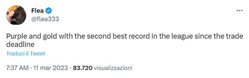 Da sempre il bassista dei Red Hot Chili Peppers non fa niente per nascondere la sua viscerale passione per i Los Angeles Lakers. Spesso in prima fila alla Crypto.com Arena, segue però i destini dei gialloviola anche via Twitter, con un trasporto eccezionale. Ecco come ha commentato, dal via di questo 2023, la travagliata stagione dei Lakers, contraddistinta da tante mosse di mercato e dall'obiettivo playoff centrato a fatica, e che da stanotte li vedrà sfidare Memphis (diretta alle 21 su Sky Sport NBA)