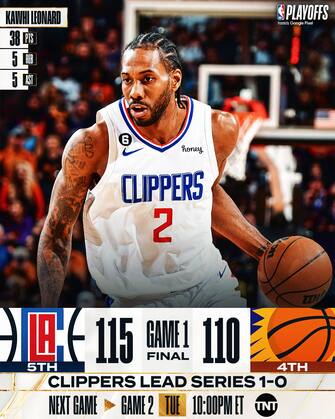 Phoenix perde dunque la prima partita con Kevin Durant sul parquet, autore di 27 punti, 11 assist e nove rimbalzi con 7/15 al tiro; un punto in più di quelli realizzati da un Devin Booker da 10/19 dal campo che aggiunge anche quattro recuperi e tre stoppate, mentre a Chris Paul mancano tre punti per raccogliere una tripla doppia da 11 rimbalzi e 10 passaggi vincenti. Non basta ai Suns il 15-0 di parziale con cui provano ad allungare a metà gara: fondamentale per i padroni di casa sarà evitare di perdere anche gara-2