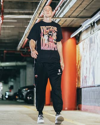 Max Strus con maglia di Oladipo e bermuda prima del match