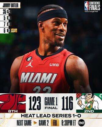 Miami vince di nuovo gara-1 in trasferta per la terza serie consecutiva, sbancando il TD Garden di Boston sulle spalle di un monumentale Jimmy Butler da 35 punti e altri cinque giocatori a quota 15, tra cui i 20 di Bam Adebayo. Decisivo un terzo quarto da 46 punti per gli ospiti, che tirano 16/31 dalla lunga distanza nel match. Ai Celtics non bastano i 30 punti di un Jayson Tatum che non tenta neanche un tiro nel quarto periodo: gara-2 nella notte tra venerdì e sabato sarà già delicatissima per Boston