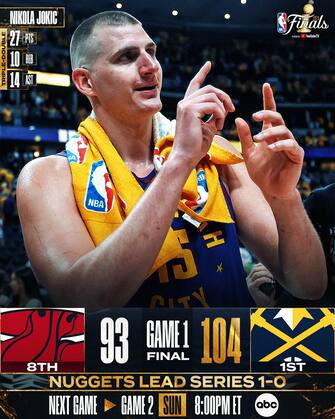 Trascinati dalla nona tripla doppia di Nikola Jokic ai playoff, i Denver Nuggets vincono gara-1 contro i Miami Heat portandosi subito in vantaggio nella serie, confermandosi imbattuti in casa (nove vittorie su nove). Il due volte MVP chiude con 27 punti, 10 rimbalzi e 14 assist, Jamal Murray ne aggiunge 26 e l'attacco dei Nuggets gira a pieno regime, mentre Miami fa fatica fisicamente a tenere il passo aggrappandosi ai 26 punti di Bam Adebayo. Gara-2 nella notte tra domenica 4 e lunedì 5 alle 2.00 in diretta su Sky