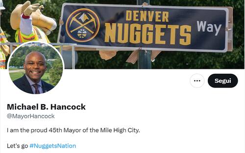 SINDACO & TIFOSO | La "fede" nei Nuggets del sindaco di Denver è testimoniata dalla sua immagine copertina sul profilo di Twitter. Dove si definisce sì come "l'orgoglioso 45° sindaco di Denver" ma immediatamente aggiunge il grido: "Forza Nuggets"