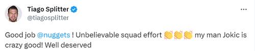 TIAGO SPLITTER | "Bel lavoro Nuggets! Uno sforzo di squadra incredibile, e il mio uomo Jokic è fortissimo! Strameritato"