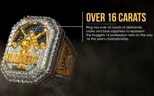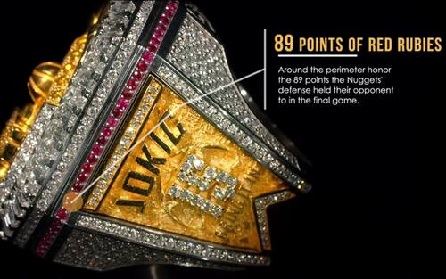 - Un'altra cifra significativa trova spazio nel pezzo di gioielleria consegnato nelle mani dei giocatori dei Nuggets: ci sono infatti 89 rubini rossi, uno per ogni punto concesso ai Miami Heat nella quinta e decisiva gara delle ultime finali NBA