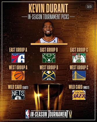 - Chiamato a esprimere le sue previsioni sul destino dei sei gironi (che qualificano le prime arrivate più le due migliori seconde, una a Est e una a Ovest) è stato nientemeno che Kevin Durant, due volte campione NBA con i Golden State Warriors e ora alla ricerca del suo terzo titolo NBA con i Phoenix Suns. O magari, in alternativa (o perché no, in aggiunta), anche alla caccia della sua prima NBA Cup