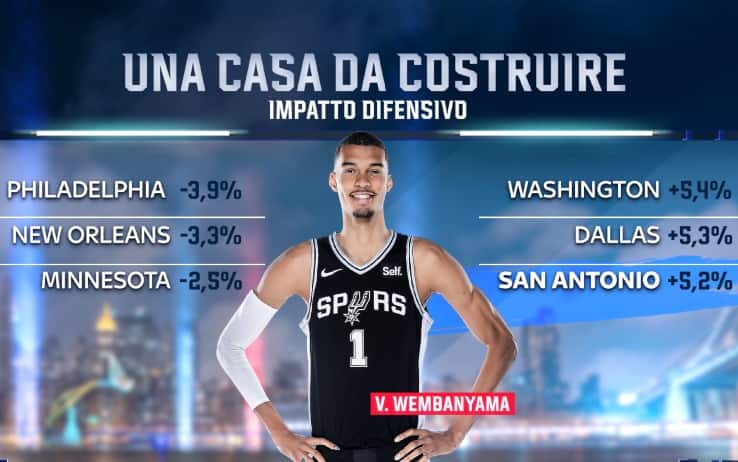 L'anno scorso i San Antonio Spurs di Gregg Popovich hanno terminato la stagione con un dubbio primato, quello di avere la peggior difesa NBA. Concedevano quasi 120 punti su 100 possessi (119.6 per l'esattezza), un dato che li rendeva fanalini di coda nella lega. Al Draft però sono arrivati i 224 centimetri di Victor Wembanyama, che fin dalle sue prime uscite a dimostrato di essere un vero incubo per qualsiasi attaccante avversario. Stoppate, certo (2.6 a sera, già terzo nella lega) ma non solo: parabole di tiro alterate, closeout miracolosi sui tiratori, intimidazione al ferro. Un dato, dopo le sue prime sei partite, rendeva l'idea meglio di tutto: i tiratori avversari, con lui come difensore primario, vedevano le proprie percentuali abbassarsi del 24%, la differenza cioè tra la percentuale reale attesa (in condizioni normale avrebbero dovuto tirare il 57.3%) e quella invece concessa dal francese (solo il 33.3%). Quindi? Spurs primi della pista per efficienza difensiva? Neppure per idea. Anzi, le cose non sono per nulle migliorate in questo avvio di stagione, a dimostrazione che la pallacanestro è sport di squadra e un singolo giocatore, per quanto influente, non può spostare da solo gli equilibri.