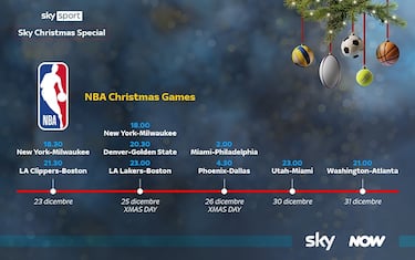 - La NBA comunque non si ferma durante le feste, anzi raddoppia: oltre alle cinque partite del Christmas Day, ci sono due appuntamenti in orario serale il 23 dicembre (New York-Milwaukee e L.A. Clippers-Boston), uno il 30 dicembre (Utah-Miami) e uno la notte di capodanno alle 21 (Washington-Atlanta), tutti da seguire in diretta su Sky con commento in italiano