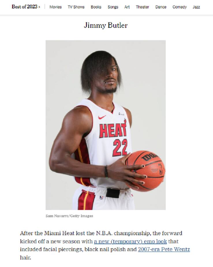 La lista inizia con Beyoncé, mentre al fianco della foto di Jimmy Butler (sì, quella foto...) si trovano Miuccia Prada e la nuova reginetta del pop Olivia Rodrigo. Ma nel consueto pezzo di fine anno del New York Times - "The most stylish people (and more) of 2023" trova posto anche l'ala di Miami. Il perché? "L'ala degli Heat ha iniziato la stagione con un nuovo (e temporaneo) look emo che comprendeva piercing, unghie pitturate di nero e un taglio di capelli alla Pete Wentz anno 2007"