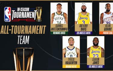 La NBA ha annunciato il quintetto ideale del primo In-Season Tournament, conclusosi con la vittoria dei Los Angeles Lakers in finale sugli Indiana Pacers a Las Vegas. I gialloviola piazzano due giocatori tra i quattro che hanno preso unanimemente i voti da parte dei 20 membri dei media chiamati a esprimere le loro preferenze: ecco le votazioni complete