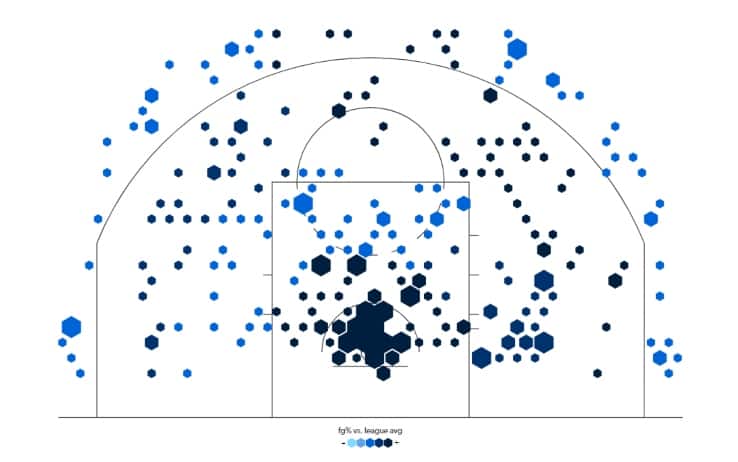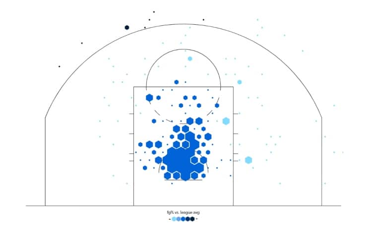 La sua mappa di tiro, se confrontata a quella dei playoff 2020, sottolinea proprio questa differenza. Nella postseason conclusa nella bolla di Orlando, infatti, ben il 32% dei tiri di Davis era scagliato dal mid-range (e realizzato sfiorando un superbo 50%), mentre quasi il 17% dei tiri da lui tentati arrivava da oltre l'arco (dove le percentuali, per un lungo, erano eccellenti, oltre il 38%). Oggi invece dal mid-range tira poco (solo il 14% delle sue conclusioni) e male (con il 23%) e fin qui in tutta la stagione ha tentato soltanto 18 triple, nonostante coach Ham a inizio stagione avesse dichiarato di voler vedere Davis tentare almeno 6 triple a partita (se ne prende invece meno di una).
