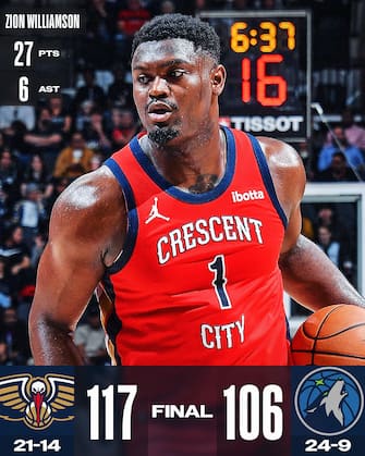 - I Pelicans si presentano a Minneapolis tirando con il 55.7% dal campo, hanno 27 punti da Zion Williamson, 24 da CJ McCollum e 19 da Brandon Ingram e sulle spalle dei suoi big three strappa una prestigiosa vittoria in trasferta. I Timberwolves perdono la seconda partita in casa di questa stagione, nonostante un ottimo Anthony Edwards e un Karl-Anthony Towns da 22 punti, pagando la battaglia persa a rimbalzo (41-28 per New Orleans) e il 10/31 da tre di squadra