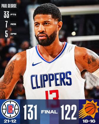 - L’importante vittoria in trasferta a Phoenix, la 13° nelle ultime 15 partite per i Clippers, porta la firma di Paul George. L’ala chiude con 33 punti tirando 8/14 dal campo, risultato frutto di una selezione di tiro quasi chirurgica e che non lascia scampo alla difesa dei Suns. Nella partita di George ci sono anche 7 rimbalzi, 3 assist e 2 palle rubate