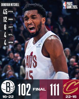 - A brillare nella notte parigina è la stella di Donovan Mitchell, assoluto protagonista del Paris Game 2024. È lui a trascinare i Cavs, che conducono dall’inizio alla fine anche grazie alla doppia doppia da 12 punti e 12 rimbalzi di Jarrett Allen e ai 21 punti di Caris LeVert entrando dalla panchina. Ai Nets servono poco i 26 punti a testa di Mikal Bridges e Cam Thomas, perché la squadra non da mai davvero la sensazione di potersela giocare