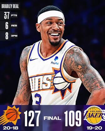 - Dopo una prima parte di stagione tormentata dai guai fisici, nella sfida contro i Lakers si vede per la prima volta il “vero” Bradley Beal in maglia Suns. L’ex Washington manda a referto 37 punti tirando 14/21 dal campo e 8/10 da tre, aggiungendo alla sua prestazione anche 6 rimbalzi e 4 assist nei 32 minuti giocati