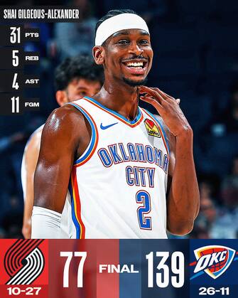 - I Thunder dominano la sfida con i Blazers, ottengono la vittoria con il 5° margine più ampio nella storia della NBA e raggiungono Minnesota in testa alla classifica della Western Conference. Oklahoma City ha il solito, ottimo Shai Gilgeous-Alexander, oltre a un Jalen Williams da 21 punti e una tripla doppia da 13 punti, 12 assist e 10 rimbalzi firmata Josh Giddey. Portland è disastrosa, viene subissata a rimbalzo (59-42), concede il 57% dal campo agli avversari e tira con il 27.7%