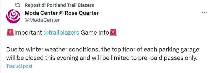 Curiosa defezione dell'ultimo minuto nella sfida tra Blazers e Nets, vinta dai padroni di casa con il canestro decisivo di Anfernee Simons. Il centro di Portland, atteso al rientro dopo 11 gare ai box per un problema al ginocchio, non è riuscito ad aver la meglio delle strade ghiacciate del suo quartiere e ha finito per non raggiungere mai il Moda Center