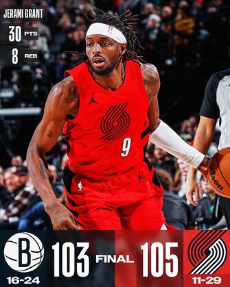 - Il milgior marcatore tra i Blazers è un Jerami Grant che ne mette 30 con un ottimo 14/26 dal campo ma l'eroe della serata è Anfernee Simons. Coach Billups mette nelle sue mani il pallone della vittoria e il floater del giovane talento di Portland (autore di 20 punti, con 20 tiri) condanna al ko i Nets, che oppongono resistenza solo con Bridges (21 punti ma brutte percentuali) e Claxton, in doppia doppia con 12 punti e 12 rimbalzi