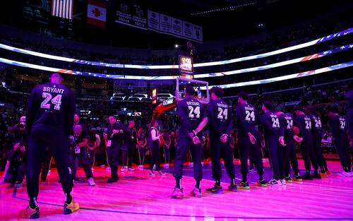 - Dopo la cerimonia c'è stata la sfida tra i Lakers e i campioni in carica di Denver, LeBron e compagni sono scesi in campo tutti con una soprammaglia con il nome Bryant sulla schiena e il numero 24. Sul davanti della il simbolo di Kobe