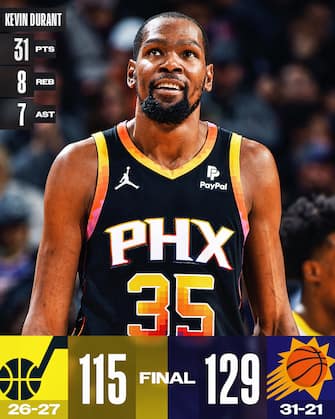 - Kevin Durant (31 punti e 8 rimbalzi) e Bradley Beal (30 punti e 7 assist) fanno vedere tutto il differenziale a livello di talento tra Suns e Jazz e Phoenix ottiene la 5° vittoria casalinga consecutiva. Gli ospiti hanno 22 punti di Lauri Markkanen e la doppia doppia da 21 punti e 14 rimbalzi di John Collins ma riescono solo a inseguire senza mai riuscire ad avvicinarsi nel punteggio