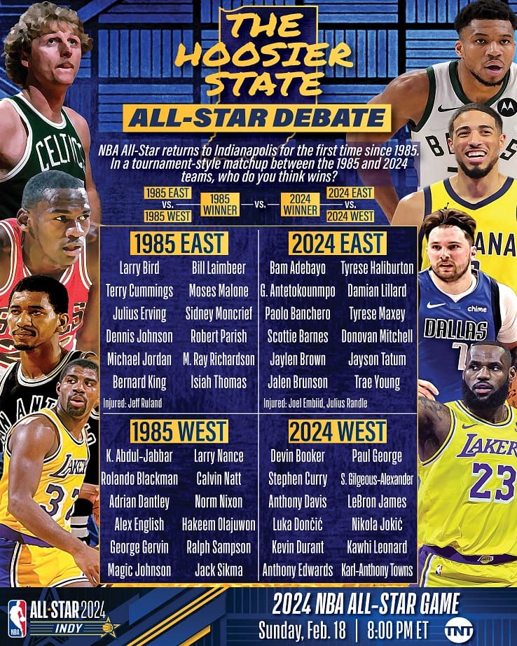 Questo legame fortissimo fra Hoosier State e basket torna d'attualità anche in questo 2024, a quasi 40 anni da quel primo All-Star Game: la NBA ha scelto di "formare" un quintetto base all-time dei migliori giocatori nati o cresciuti in Indiana. I nomi dei cinque campioni selezionati fanno capire la ricchezza della tradizione statale, da Oscar Robertson a Larry Bird, da Glenn Robinson (super protagonista al college di Purdue) a George McGinnis fino ad arrivare a Shawn Kemp. Un'altra iniziativa pensata dalla lega è quella di lanciare un sondaggio per chiedere ai tifosi di tutto il mondo chi uscirebbe vincente da un ipotetico scontro tra i roster del 1985 e quelli del 2024, entrambi divisi tra Est e Ovest.