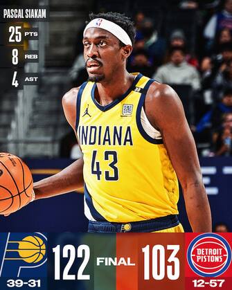 - Indiana domina nel pitturato (70-54 il conteggio dei punti in area), trova 25 punti con 8 rimbalzi e 4 assist da Pascal Siakam e ottiene una netta vittoria a Detroit. Gli ospiti hanno anche un Tyrese Haliburton da 20 punti e 9 assisti. I Pistons, senza Simone Fontecchio fermo per un problema al piede, non riescono mai ad entrare davvero in partita nonostante le doppie doppie di Cade Cunningham (23 punti e 10 assist) e Jalen Duren (11 punti e 12 rimbalzi)