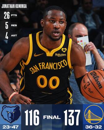 - Per una serata gli Warriors assomigliano alla vecchia versione di sé stessi, travolgendo Memphis con una partita in cui i ragazzi di Steve Kerr, reduci da 3 sconfitte consecutive, tirano con il 58% dal campo e il 48.7% da tre. I Grizzlies, sempre provati dalle tantissime assenze, trovano 28 punti da Jaren Jackson Jr. e danno spazio ad un GG Jackson sempre più convincente. Golden State ha invece una doppia doppia da 22 punti e 10 rimbalzi da Andrew Wiggins
