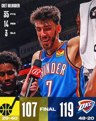 - La doppia doppia (35 punti e 14 rimbalzi) di Chet Holmgren consente al lungo dei Thunder di pareggiare il career high per rimbalzi e scava il solco tra i padroni di casa e i Jazz, anche perché Holmgren aggiunge 3 stoppate e tira 12/18 dal campo risultando del tutto immarcabile per Utah