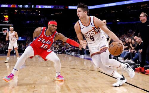 - I Suns dominano la parte centrale della partita, chiudendo di fatto i conti già a cavallo dell’intervallo lungo, e battono nettamente Philadelphia. Le speranze dei Sixers si spengono sulla serataccia al tiro (3/13) di Tyrese Maxey, mentre Phoenix trova un Grayson Allen in stato di grazia al tiro e viaggia tranquilla grazie ai 22 punti e 8 rimbalzi di Kevin Durant e alla doppia doppia da 18 punti e 11 assist di Devin Booker