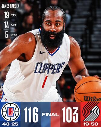 - Dopo aver perso 4 delle ultime 5 partite, i Clippers si riprendono con una solida vittoria sul campo dei Blazers guidati dai soliti Kawhi Leonard (24 punti e 4 rimbalzi) e Paul George (27 punti e 6 rimbalzi). James Harden aggiunge una doppia doppia da 19 punti e 14 assist e gli ospiti gestiscono punteggio e ritmo di gioco senza particolari problemi. Portland si consola con la discreta prova (18 punti e 5 assist, ma tirando 6/15 dal campo) di Scoot Henderson