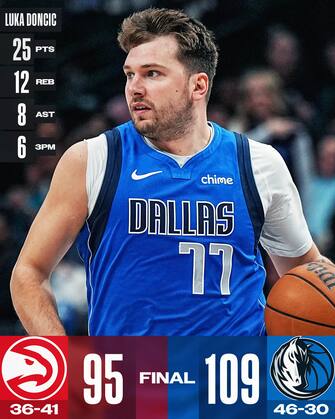 - Dopo un 1° quarto interlocutorio, i Mavs cambiano marcia e prendono possesso della sfida contro Atlanta, conducendo poi senza esitazioni fino alla fine. Luka Doncic (26 punti, 12 rimbalzi e 8 assist) e Kyrie Irving(26 punti e 5 assist) guidano Dallas, che ha anche 19 punti e 8 rimbalzi da un P.J. Washington sempre più convincente. Gara tutto sommato anonima per gli Hawks, con il duo Dejounte Murray-Bogdan Bogdanovicche tira 12/32 dal campo