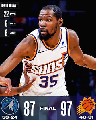 - Vittoria convincente per i Suns, che prendono 15 punti di vantaggio con un parziale fulminante da 15-0 dopo 4 minuti e non si voltano più indietro, mantenendo sempre almeno una doppia cifra di vantaggio toccando anche il +23 nel corso del match contro una possibile rivale ai playoff. I padroni di casa mandano tutto i quintetto in doppia cifra guidato dai 23 di Grayson Allen e i 22 di Kevin Durant, mentre gli ospiti hanno solo i 17 punti di Anthony Edwards in una brutta serata offensiva