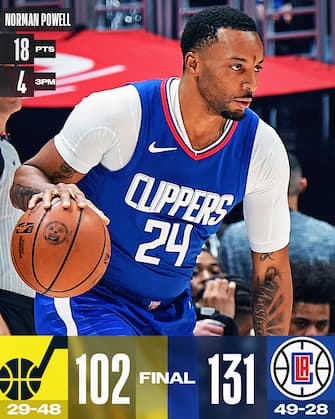 - Vittoria in scioltezza per i Clippers, che toccano addirittura il +26 in un primo quarto assolutamente senza alcuna discussione, fino al massimo vantaggio sul +38 sul finire del primo tempo e un secondo tempo di assoluto relax. James Harden ne approfitta per realizzare una tripla doppia da 13 punti, 10 rimbalzi e 15 assist, guidando altri sette compagni in doppia cifra tra cui i 19 di Terance Mann. Gli ormai demotivati Jazz non vanno oltre i 17 punti di Talen Horton-Tucker