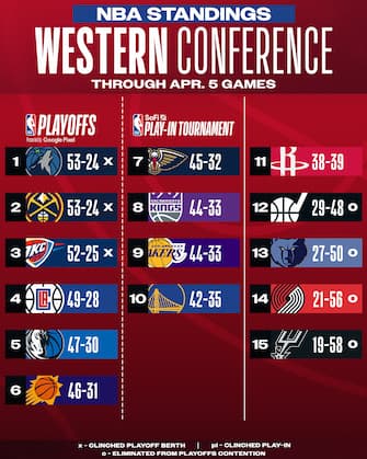- Minnesota e OKC non approfittano del ko di Denver a Los Angeles di ieri notte, mentre i Clippers continuano a difendere il quarto posto da Dallas (sotto di due gare) e Phoenix (di tre). New Orleans e Sacramento ora devono guardarsi le spalle dai Lakers che possono salire dal nono posto, quasi scontato ormai invece il decimo di Golden State. La striscia di sconfitte più lunga in NBA è quella dei Jazz (11 in fila)