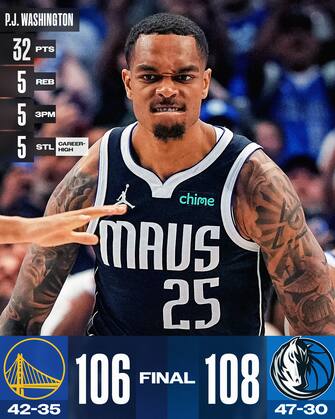 - Il successo di Dallas porta la firma di P.J. Washington, al suo massimo personale in maglia Mavs: l’ex giocatore di Charlotte griffa una serata da 32 punti impreziosita dal canestro della vittoria mandato a bersaglio a 4.5 secondi dalla fine. Washington chiude con 12/18 dal campo (e 5/8 da tre) ma trova complicità nella super gara di Irving, autore di 26 punti, 8 rimbalzi e 7 assist, 4^ vittoria nelle 7 gare giocate dall’ex Duke senza Doncic al suo fianco. Dallas coglie il 13° successo nelle ultime 15 gare