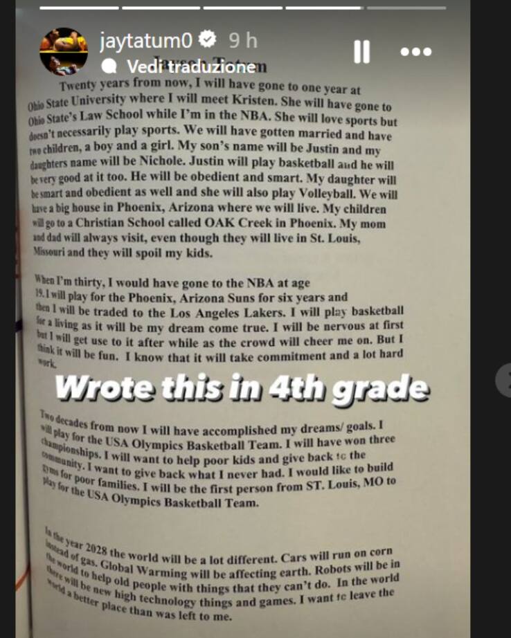 Pubblicato sui suoi canali social, un tema scritto a 10 anni, in 4^ elementare, dall'attuale superstar dei Boston Celtics raccontava desideri, sogni e obiettivi di un ragazzino che aveva già chiara la volontà di giocare non solo in NBA ma anche con la maglia di Team USA alle Olimpiadi. Esattamente come sta facendo in questi giorni di preparazione in vista di Parigi 2024