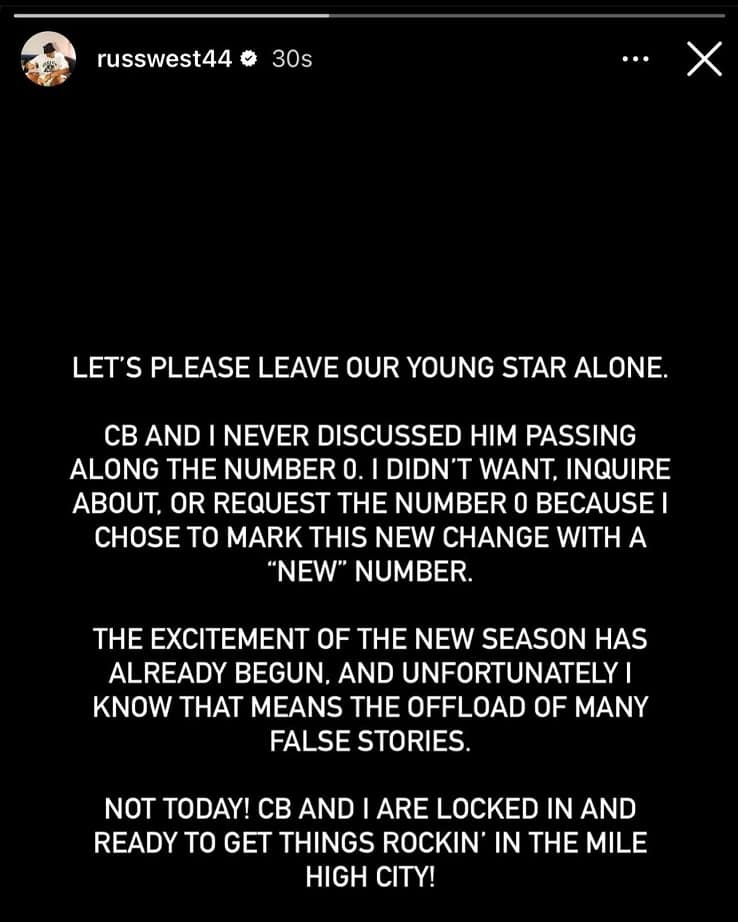"Lasciate in pagina la nostra giovane stellina", ha scritto l'ex giocatore di OKC, Rockets, Lakers e Clippers, in una storia su Instagram. "Non c'è stata nessuna discussione tra me e lui perché io potessi avere il numero zero. Non lo voglio, e non l'ho mai chiesto, perchè ho scelto di sottolineare questo nuovo cambio nella mia carriera con un 'nuovo' numero. L'entusiasmo per la nuova stagione è già iniziato e questo purtroppo vuol dire la fabbricazione di tante storie inventate. Ma oggi non voglio permetterlo! Io e CB (Christian Braun) non vediamo l'ora di far divertire i tifosi della Mile High City", ha concluso Westbrook nel suo messaggio. Un Westbrook che quindi a Denver indosserà il numero 4, l'anno scorso sulle spalle di Hunter Tyson, che da rookie è sceso in campo per 18 partite con i Nuggets. E che dall'anno prossimo, invece, sfoggerà il n°5.