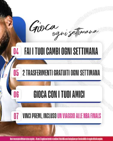 Anche quest’anno torna il fantabasket sul sito di SkySport.it: potrete creare la vostra squadra dei sogni con NBA Fantasy, realizzato direttamente dalla NBA. Dieci giocatori, 100 milioni a disposizione, un viaggio per due persone per le NBA Finals in palio e tante altre sorprese tutte da scoprire per divertirvi con gli amici e sfidare gli appassionati di tutto il mondo. Scopri tutto il regolamento e le novità di quest’anno di seguito