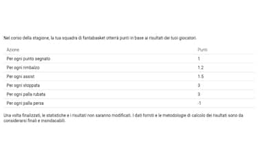 Durante la stagione, la tua squadra di fantabasket otterrà punti in base alle prestazioni dei tuoi giocatori, utilizzando le principali categorie statistiche (punti, rimbalzi, assist, recuperi, stoppate, palle perse). Una volta finalizzati, le statistiche e i risultati non saranno modificati. I dati forniti e le metodologie di calcolo dei risultati sono da considerarsi finali e insindacabili.