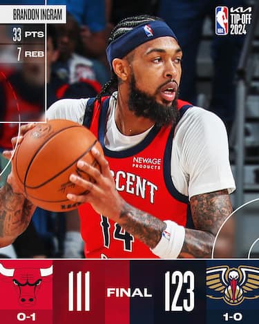 Zion Williams da forfait all’ultimo minuto per un’influenza, ma i Pelicans riescono comunque a vincere in casa grazie a un ottimo secondo tempo, nel quale spicca un Brandon Ingram da 33 punti, accompagnato dai 23 di CJ McCollum e dai 12 con 7 rimbalzi e 3 stoppate del rookie Yves Missi sotto canestro. La peggior notizia di serata è però la sospetta frattura alla mano subita da Dejounte Murray, che aveva cominciato la sua nuova avventura sfiorando la tripla doppia con 14 punti, 8 rimbalzi e 10 assist. I Bulls festeggiano il ritorno in campo in regular season di Lonzo Ball (5 punti) ma le 21 palle perse commesse di squadra rendono inutili i 27 punti di Zach LaVine e i 21+11 di Nikola Vucevic